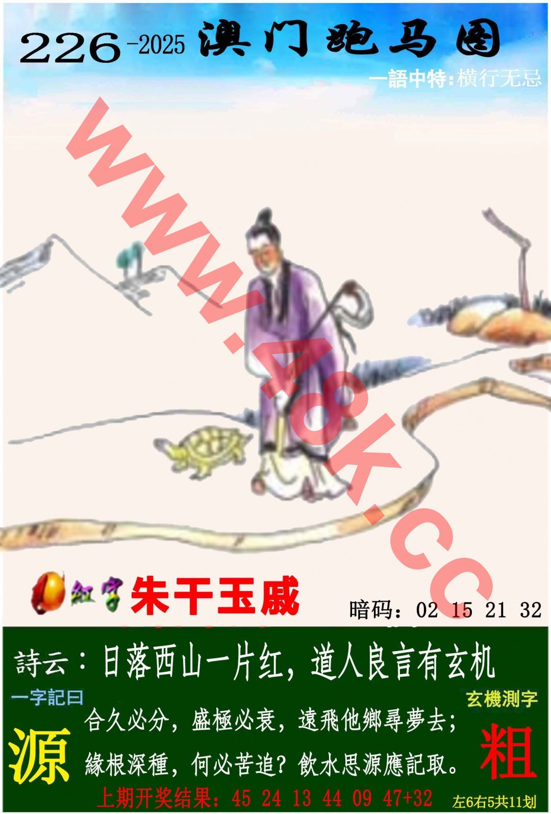 2025-226期一字記之曰:《源》 合久必分,盛極必衰,遠飛他鄉尋夢去 緣根深種,何必苦追?飲水思源應記取 【粗】<br> 解析:十二生肖解人生哲理:(取龙、马、虎、猴、牛、狗、兔七肖演绎)盛衰之道,虎(寅)啸山林终敛势,应盛极必衰,龙(辰)腾九霄必还渊,合合久必分,远行与根源,马(午)踏青云寻梦去,猴(申)跃千山总恋旧林,因果轮回,牛(丑)耕故土守根本,狗(戌)守旧扉嗅前缘,兔(卯)望月宫思故里,象征体系:寅午申为三合火局,喻激情与沉淀的平衡,辰丑戌属土,象征生命根基,卯木如初心,生生不息。(七肖暗藏五行相生:木燃火、火生土、土育金、金化水,终归本源)。<font color=\\#FF0000\\\\\"><br> 综合取肖:龙马虎猴牛狗兔<br> 综合取码:26.38.24.36.16.28.34.29.08.15</font>